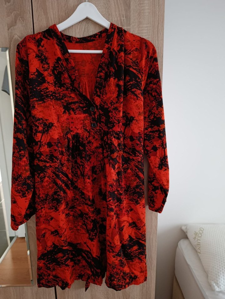 Kırmızı ve siyah desenli, bohem tarzda, bağlamalı hamile elbisesi özel dikimdir. V, düğmeli yakalı, uzun kollu, bol kesime sahiptir. Salaş ve bohem tarzıyla günlük kullanıma uygundur. Midi boydaki elbise 42-44 bedene kadar giyime uygundur.
