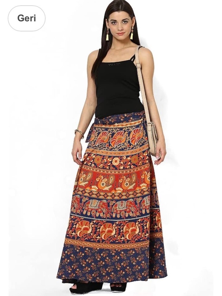 Bu uzun etek, bol kesim ve drapeli tasarımıyla canlı çok renkli bohem desenlere sahiptir, günlük kullanım için uygundur. Güncel satış fiyatı 1300₺ bir kaç defa kullandığım için fiyatını düşük tuttum