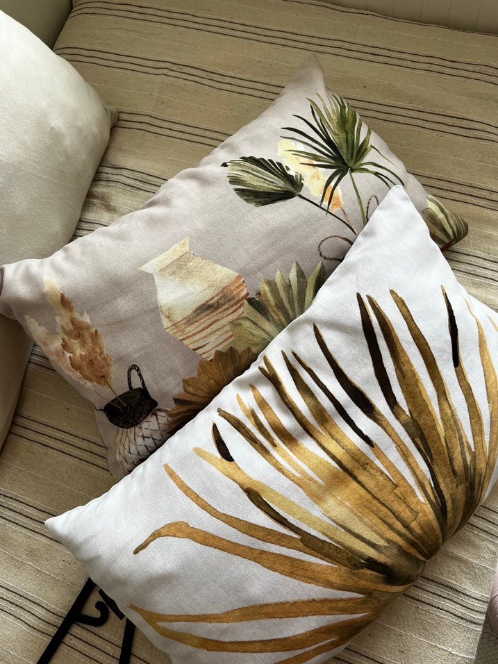 Bohem tarzda, keten kumaştan, baskılı bitkisel desenlere sahip kırlent kılıfları. Sigara yanığı var onu da ekledim. 2’li olarak gönderilecek