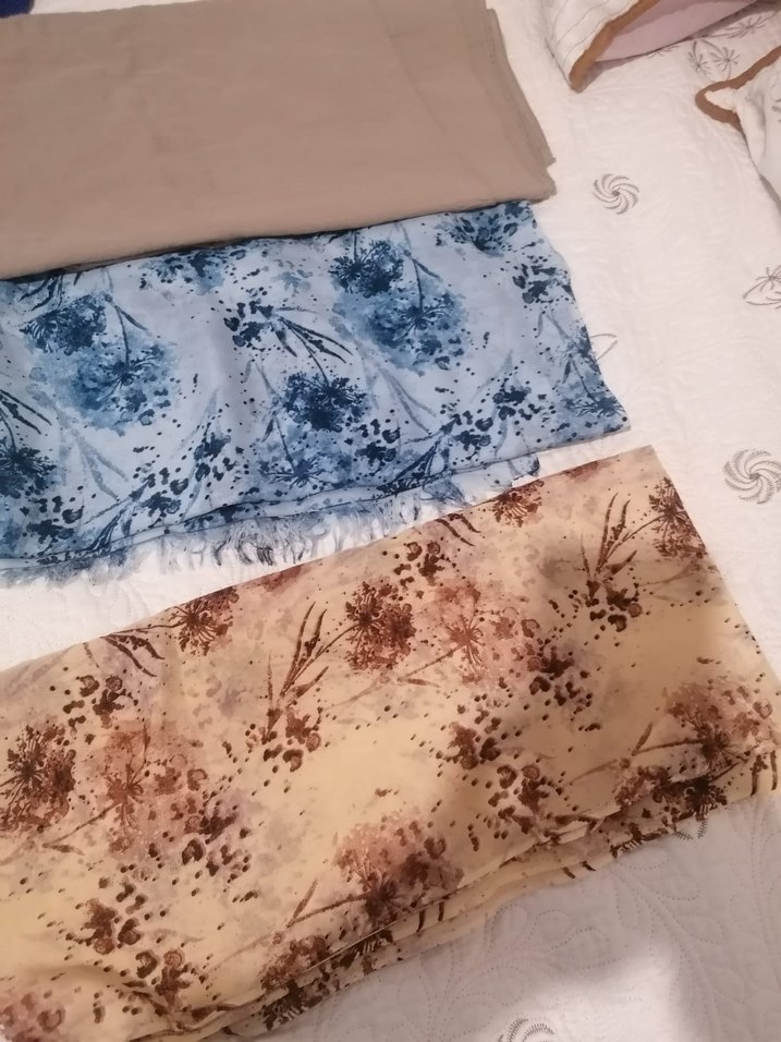 Hafif bej renkli, yumuşak sentetik kumaştan bohem tarzda kadın şalı. Dökümlü ve sanatsal çiçek desenleri bulunur.