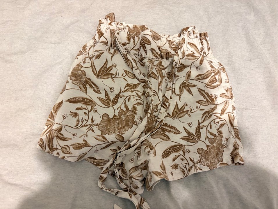 Bej renkli, çiçek desenli şort etek . Drapeli tasarımıyla rahat bir kullanım sunar, bohem stilinde mini boyda.