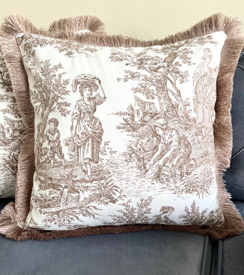 Tane fiyatıdır… 43/43cm ebatında fermuarlı Bej tonlarda baskılı bohem Fransız köylüleri desenli, püsküllü kenarlara sahip bej kırlent.