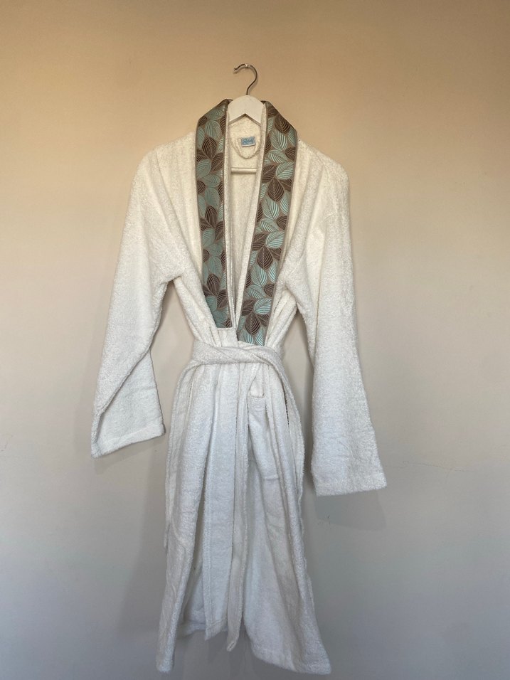 Beyaz bohem desenli yakaya sahip, yumuşak ve rahat kumaştan beyaz bornoz, belden bağlamalı.