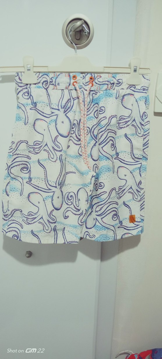 Bohem desenli, düğmeli kapamalı, gevşek kesim beyaz erkek mini şort, pastel tonlarda, plaj için uygun.
