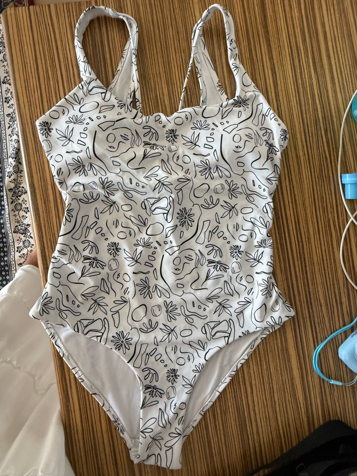 Beyaz zemin üzerine minimal bohem desenli, askılı ve midi uzunlukta, vücuda oturan kadın mayo. Plaj için zahmetsiz şıklık sunar.