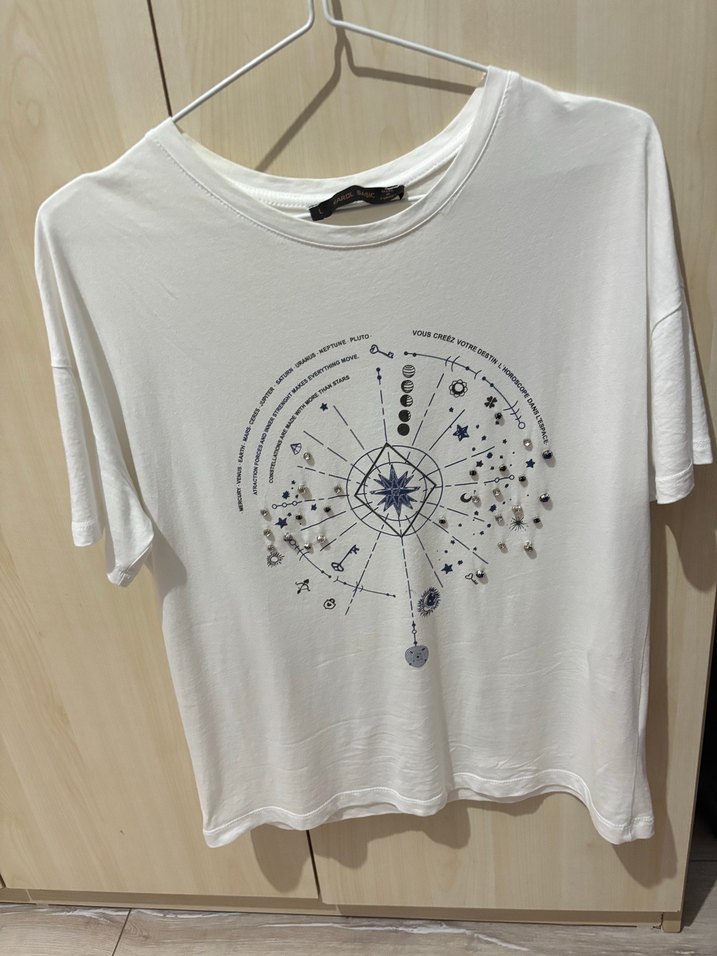 Pamuk kumaştan, bohem desenli, kısa kollu ve yuvarlak yakalı bol kesim beyaz kadın tişörtü.