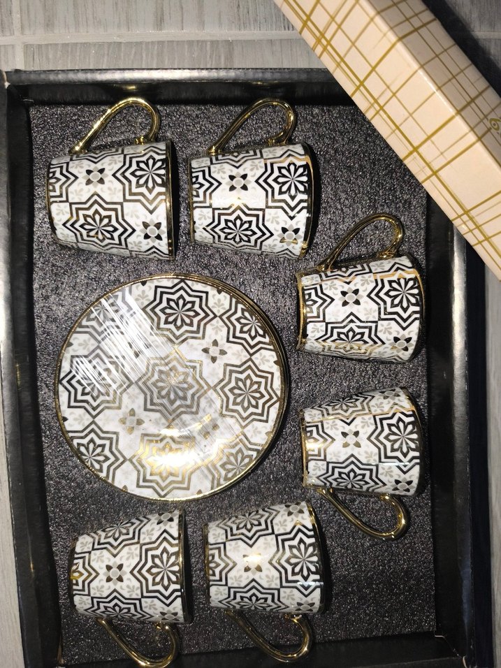 fincan seti, beyaz üzerinde koyu bohem desenlere ve altın renkli kulplara sahiptir. Altı fincan ve bir tabaktan oluşur. ☕