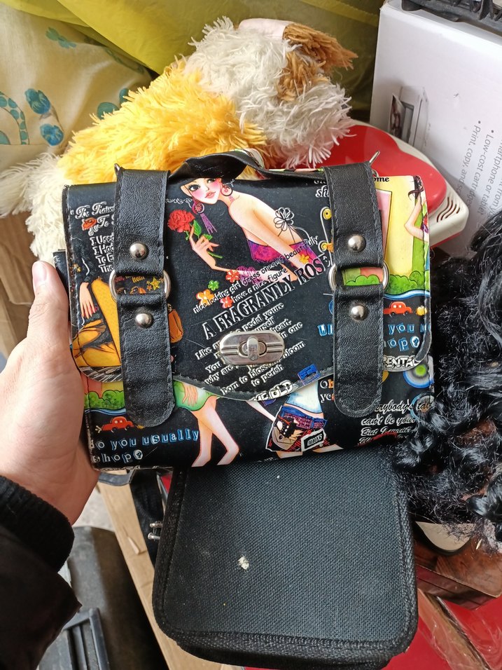 Kadınlar için baskılı deri çanta, tokalı kayışlarla bohem tarzı yansıtıyor. Koyu renkli, çok renkli ve günlük kullanıma uygun.