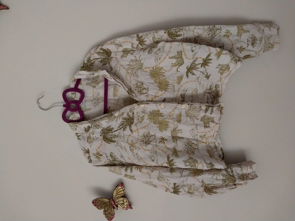 Bohem tarzı, düğmeli, uzun kollu kadın gömleği. Yumuşak tekstil kumaştan, pastel beyaz ve vintage desenlerle rahat bir kesime sahip. Ölçüleri fotolarda mevcuttur. 1 kere kullanıldı.