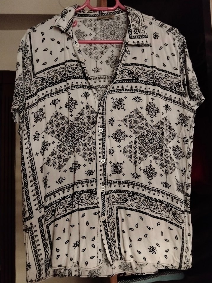 Bohem tarzda, düğmeli ve V yakalı, kısa kollu, bol kesim kadın gömleği. Beyaz ve gri desenli, yumuşak dokulu kumaştan, günlük kullanıma uygun.
