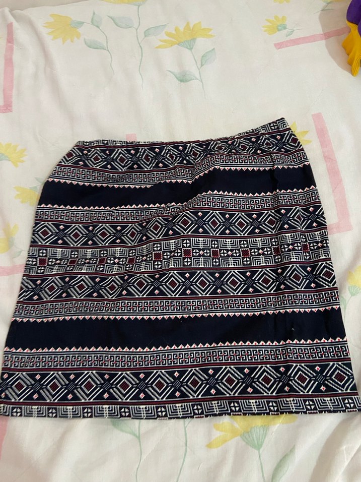 Bu dar kesim midi etek, elastik bel ve koyu renkli çoklu desenlere sahip bohem tarz s-M uyumlu