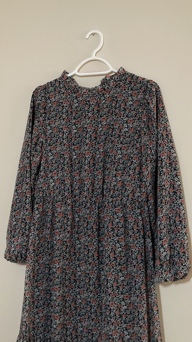 Kız çocuk bluz, uzun kollu ve yüksek yaka fırfırlı detaylara sahiptir. Çok renkli, koyu tonlarda baskılı ve bol kesimdir. Yumuşak sentetik kumaştan üretilmiştir.