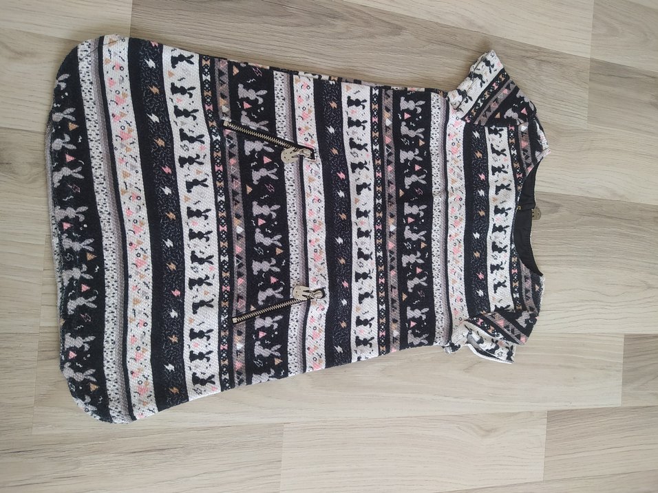 Bohem tarzda, koyu çok renkli baskılı ve fermuarlı ceplere sahip kedi kıyafeti. Rahat ve şık tasarım.