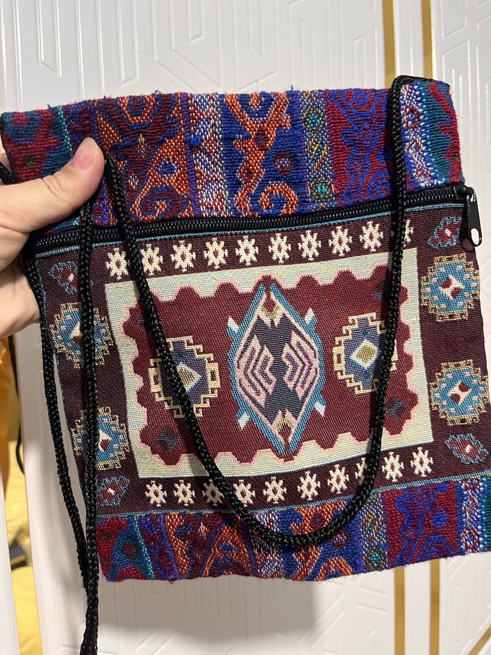 Koyu renkli çok desenli tekstil malzemeden yapılmış, fermuarlı, günlük kullanıma uygun bohem tarzda kadın çantasıdır. Taşıması kolay ip askıya sahiptir.