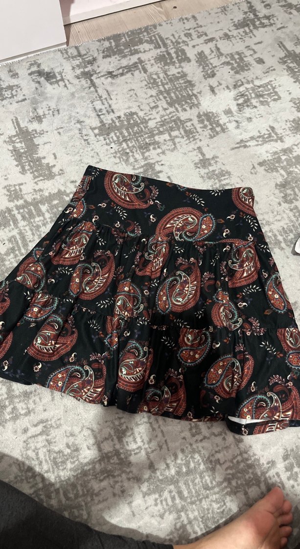Yumuşak sentetik kumaştan, bol kesim ve fırfırlı, renkli paisley desenli kısa mini etek. Romantik akşamlar için uygun.