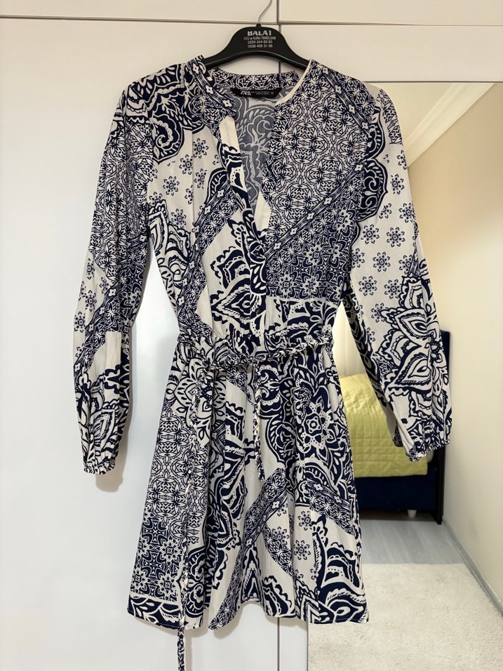 Zara belden büzgülü elbise elimde 6 adet s beden etiketli mevcut isterseniz üstte duruşunu ekleyebilirim. Gri ve beyaz bohem desenli, uzun kollu, bol kesim ve mini uzunlukta kadın elbisesi. Belde ayarlanabilir kemer bulunur.