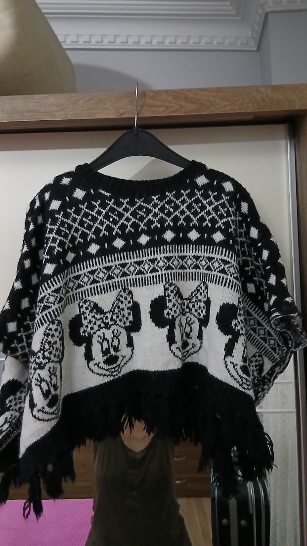 Bohem tarzı, gri-beyaz desenli, örgü, yuvarlak yaka, uzun kollu, salaş kesim midi uzunlukta cocuk panço. Etek kısmında püskül detayları bulunur.