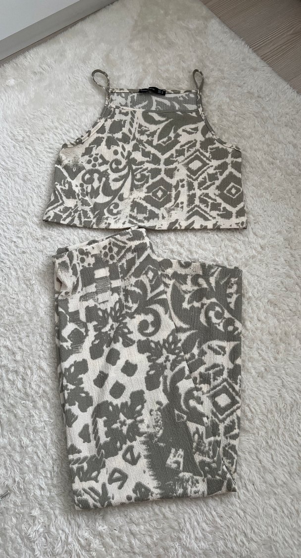 Desenli tekstil kumaştan yapılmış, straplez ve kolsuz, uzun ve vücuda oturan bohem tarzda kadın tulumu. Dantel detaylı, açık hava etkinlikleri için uygun.