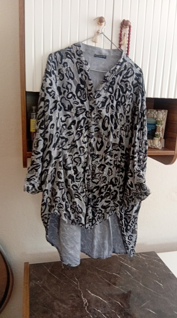 Bohem tarzda, gri desenli, keten kumaştan uzun ve bol kesim tunik. V yaka ve uzun kolludur, rahat kullanım sağlar.