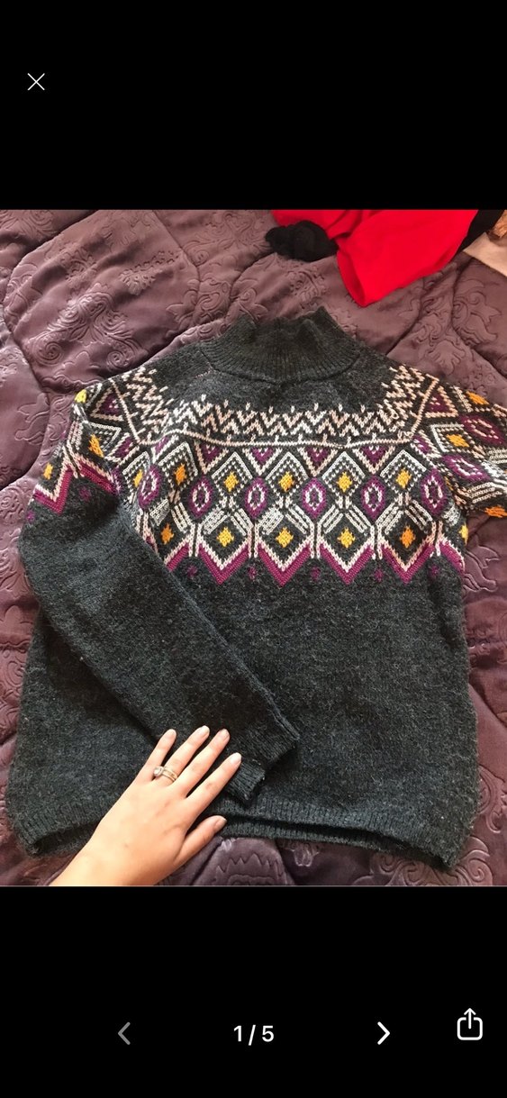 Desenli, uzun kollu, yuvarlak yaka, bol kesim gri örgü kadın kazak. Bohem tarzda, günlük kullanıma uygun.