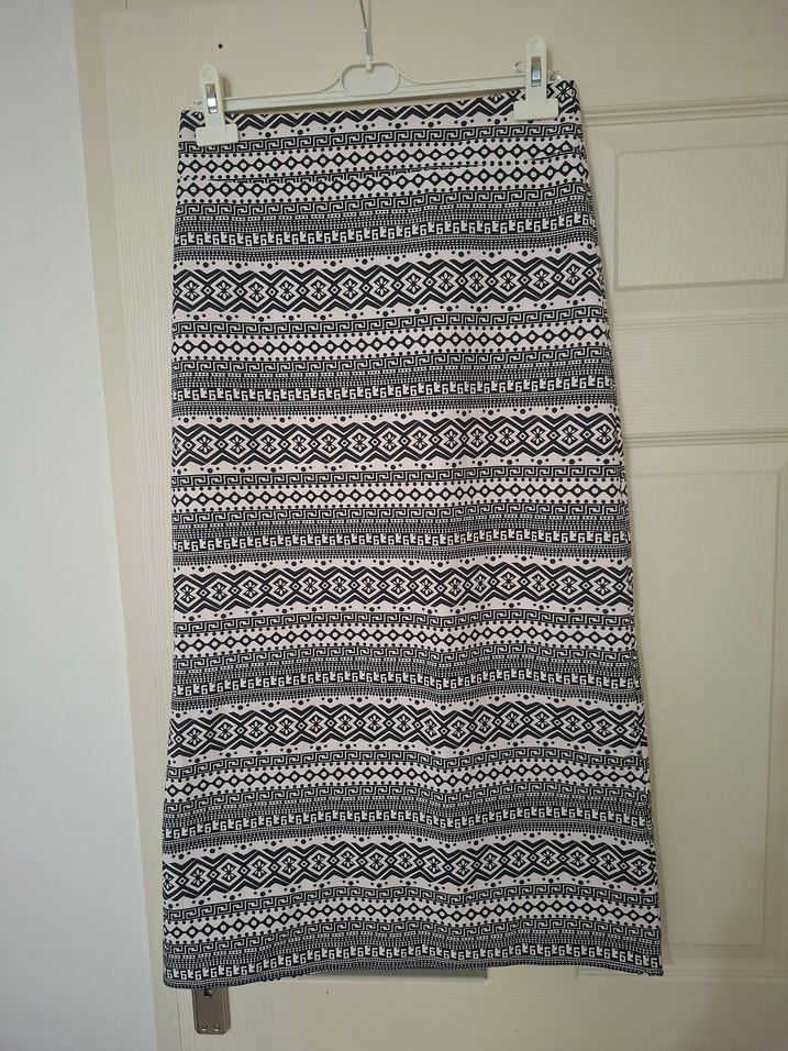 Gri renkte, bohem desenli, örme dokulu, uzun ve vücuda oturan hamile eteği. Günlük kullanıma uygundur. yeni kullanılmadı