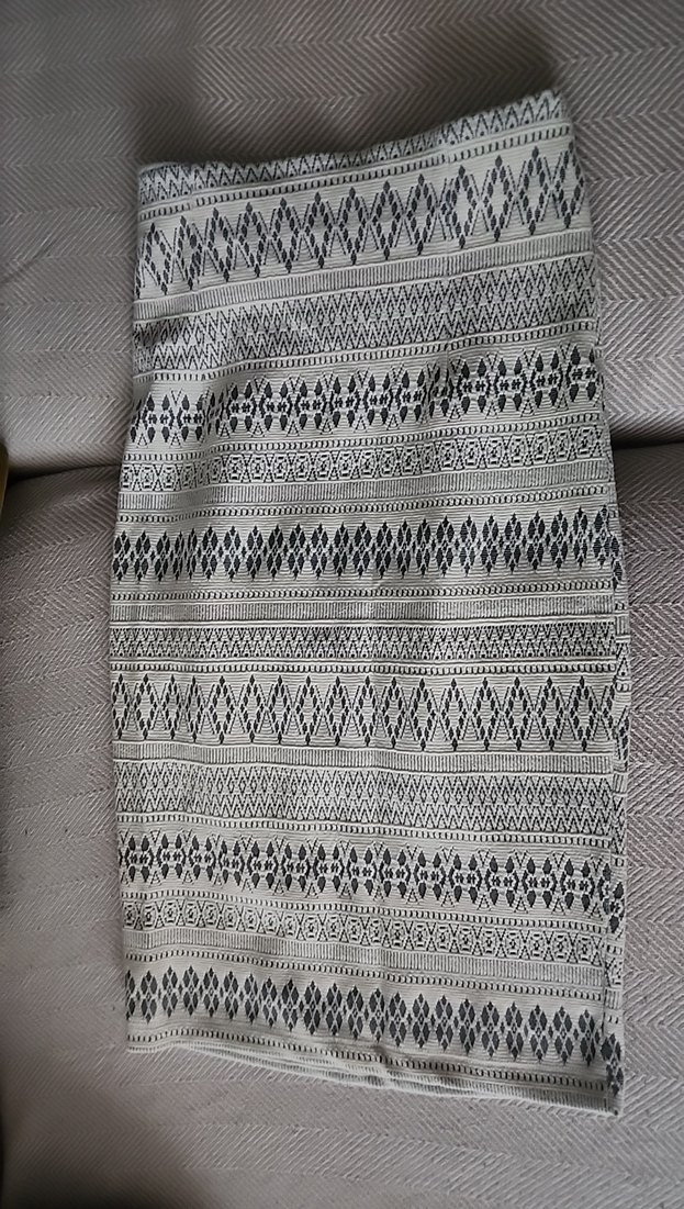 Gri renkte, bohem desenli ve örgü dokulu, uzun ve vücuda oturan rahat bir etek.