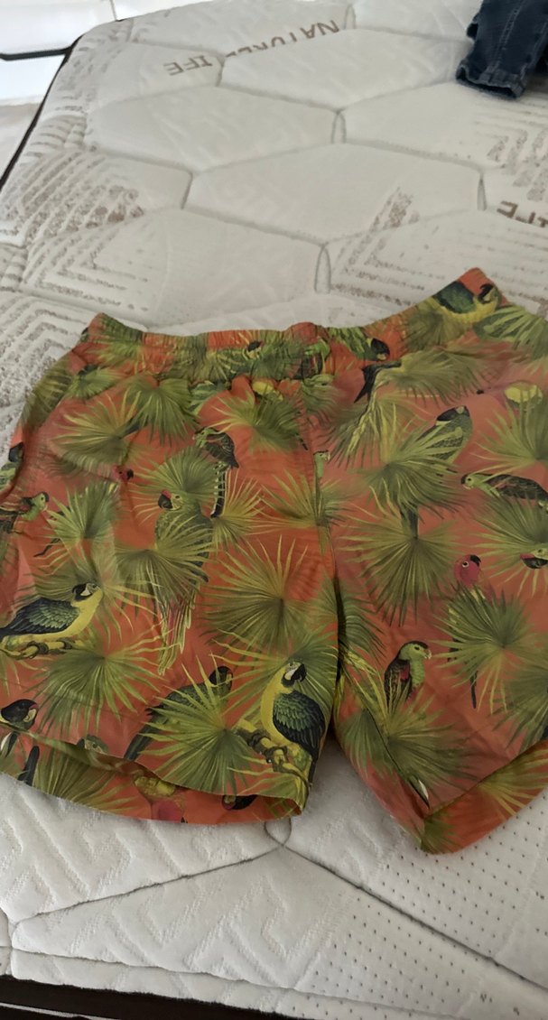 Bohem tarzı, pileli ve bol kesim hamile mini şort. Koyu renkli çok renkli tropikal desenli, yumuşak sentetik kumaştan üretilmiştir. ️