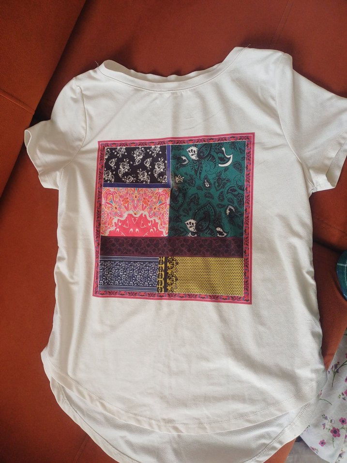 Kısa kollu, yuvarlak yaka, bol kesim hamile tişörtü. Çok renkli baskı ve dantel detaylarıyla bohem tarzı sunar.