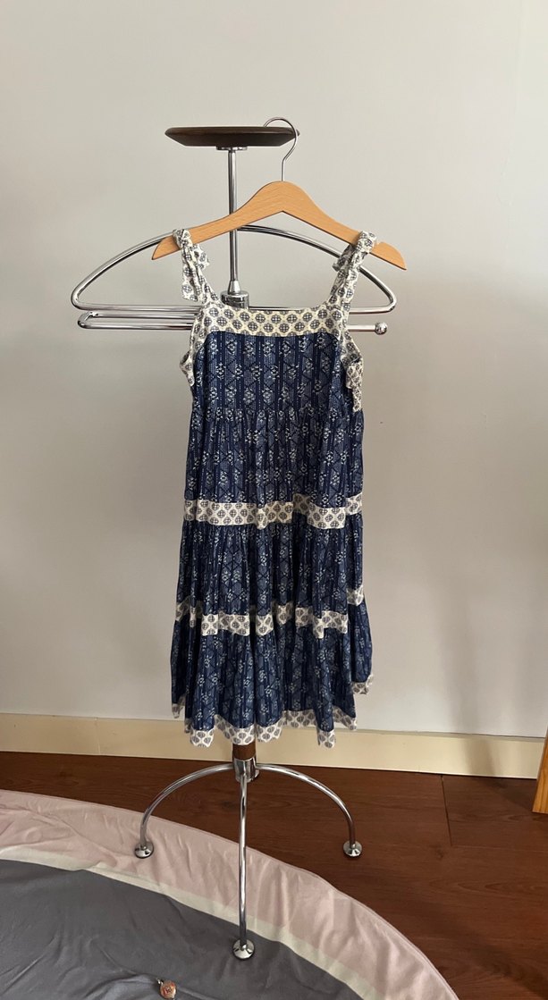 Bohem tarzda, ipli askılı ve pileli midi elbise. Lacivert ve gri batik desenli, rahat kesim, günlük kullanıma uygun.