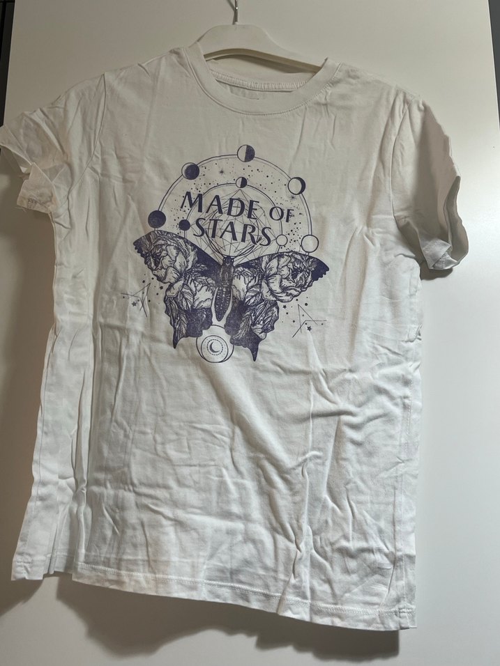 Pamuklu kumaştan, bohem desenli beyaz tişört. 'MADE OF STARS' baskılı, kısa kollu, yuvarlak yaka ve bol kesimdir. ✨