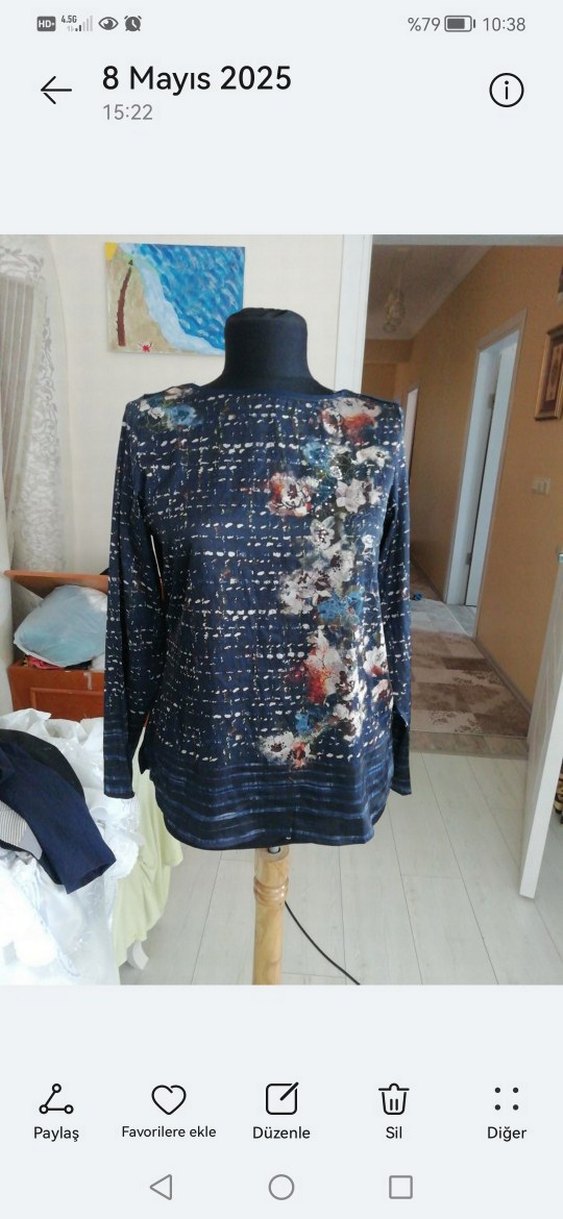 Navy renkli, yuvarlak yaka, uzun kollu kadın önü saten arkası penye bluz. Gevşek kesimi ve bohem vintage desenleriyle günlük kullanıma uygundur.