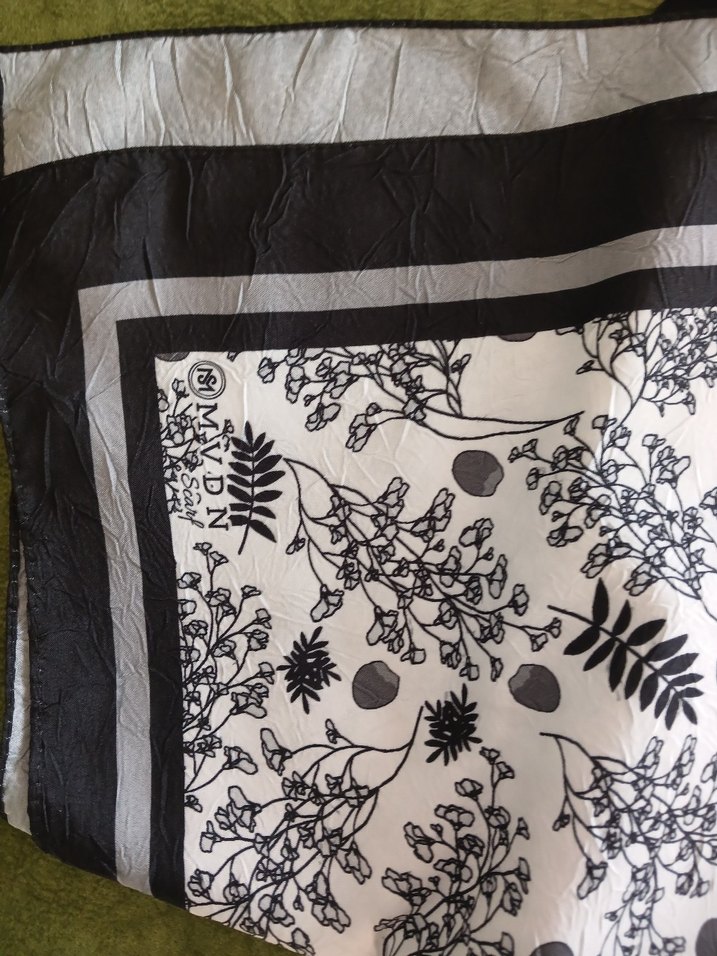 Kadınlar için beyaz zemin üzerine gri bitki desenleri baskılı, yumuşak sentetik kumaştan yapılmış bohem ve Paris tarzı fular.