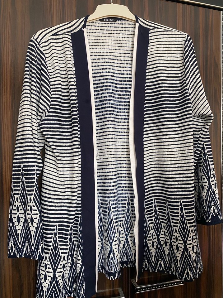 Kadınlar için bohem tarzda, desenli ve pileli dokuma kumaştan yapılmış, uzun kollu, notched lapel yaka ve bol kesimli midi uzunlukta hırka. Günlük kullanım için uygundur.