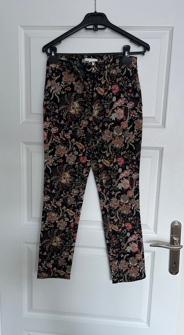 Fıt kesim, bohem desenli, çok renkli kumaş pantolon, belde tokalı, ofis kullanımı için uygun.