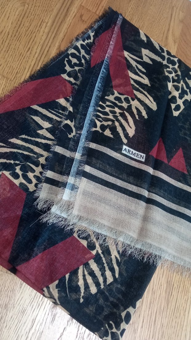 Bohem desenli, dokuma kumaştan yapılmış ve ARMEN etiketi taşıyan kadın şalı. Drapeli tarzda ve koyu tonlarda.