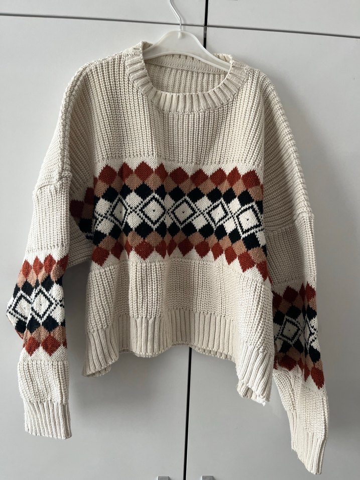 Bohem tarzı desenli, kahverengi ve gri tonlarda örgü triko kazak. Uzun kollu, yuvarlak yaka ve bol kesimdir. Çok az kullanıldı.