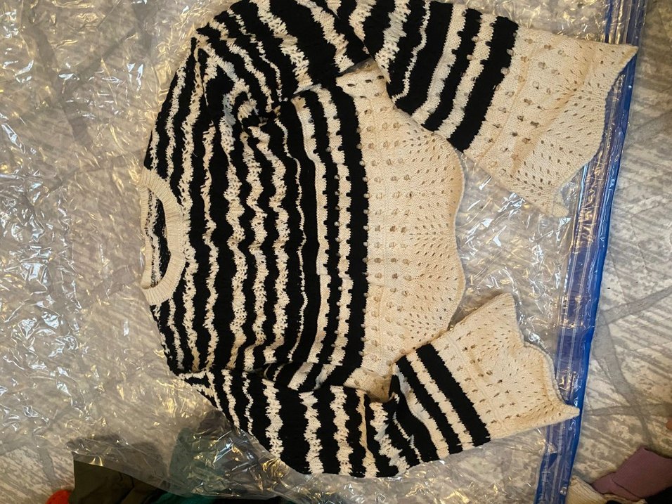 Kadınlar için bohem tarzda, uzun kollu, beyaz ve koyu desenli, gevşek kesim triko kazak. Günlük kullanım için uygundur.
