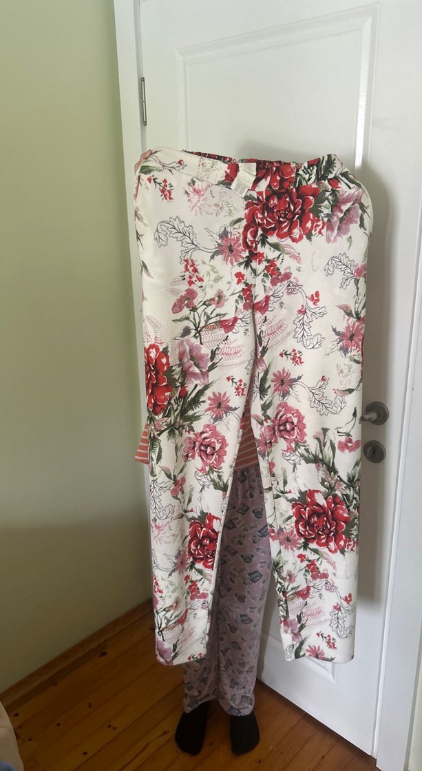 Bohem tarzı, bol kesim, uzun kumaş pantolon. Gri ve beyaz çiçek desenli, rahat ve drapeli tasarıma sahip.