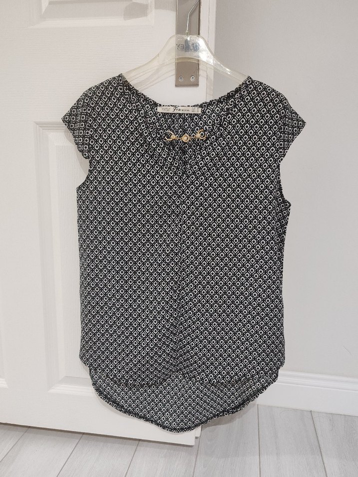 Kolsuz, bohem tarz deseniyle kadın bluz. V yaka ve tokalı detay içerir. Rahat kesim, normal boyda ve yumuşak sentetik kumaştan yapılmıştır.
