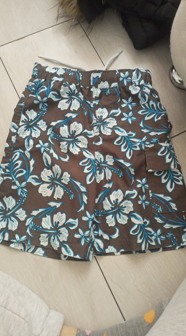 Kahverengi, bol kesim, bel detaylı, bohem desenli erkek mayo şortu, plaj için uygun.