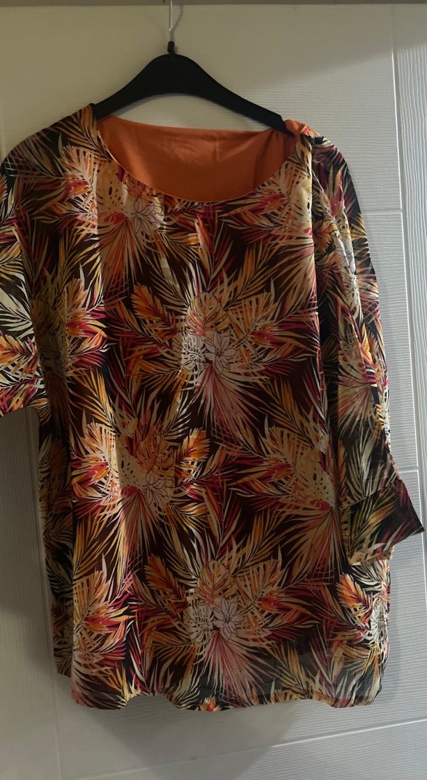 Sentetik kumaştan, bol kesim ve tekne yakalı, kısa kollu, kahverengi bohem desenli kadın bluz. Drapeli tasarıma sahiptir.