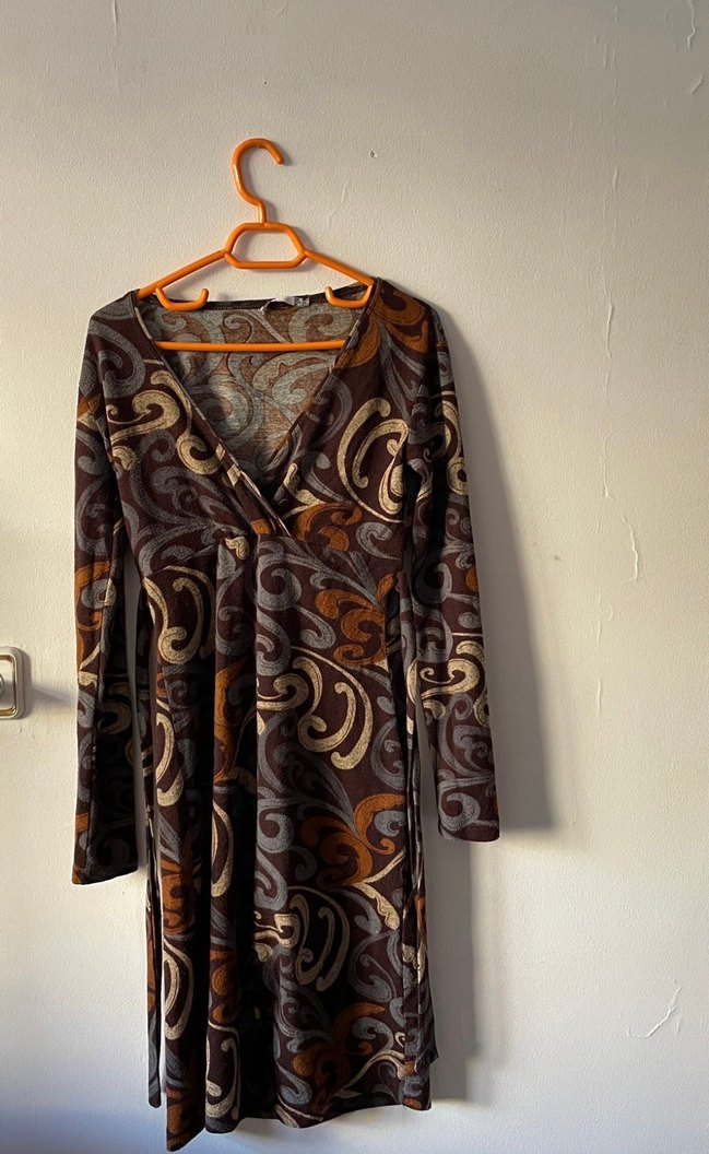 Kahverengi uzun kollu mini elbise bol kesim ve drapeli tasarıma sahip. V yaka ve desenli kumaşıyla bohem tarzını yansıtıyor.