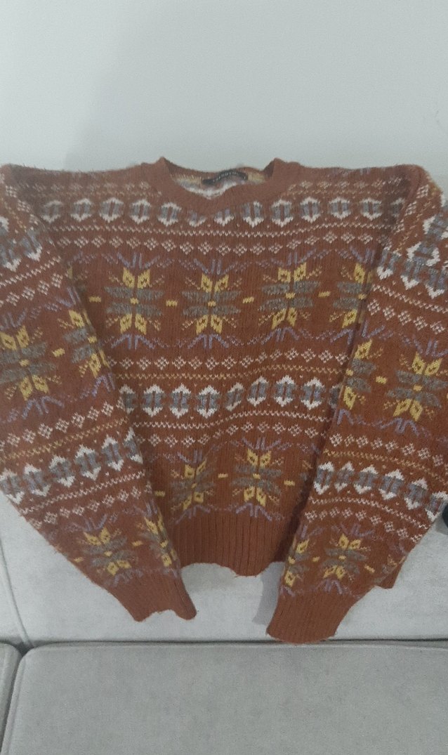Kahverengi örme kazak, bohem desenli, yuvarlak yaka ve uzun kolludur. Rahat kesimi ve sıcak dokusuyla günlük kullanıma uygundur. s beden ama m bedenede olur