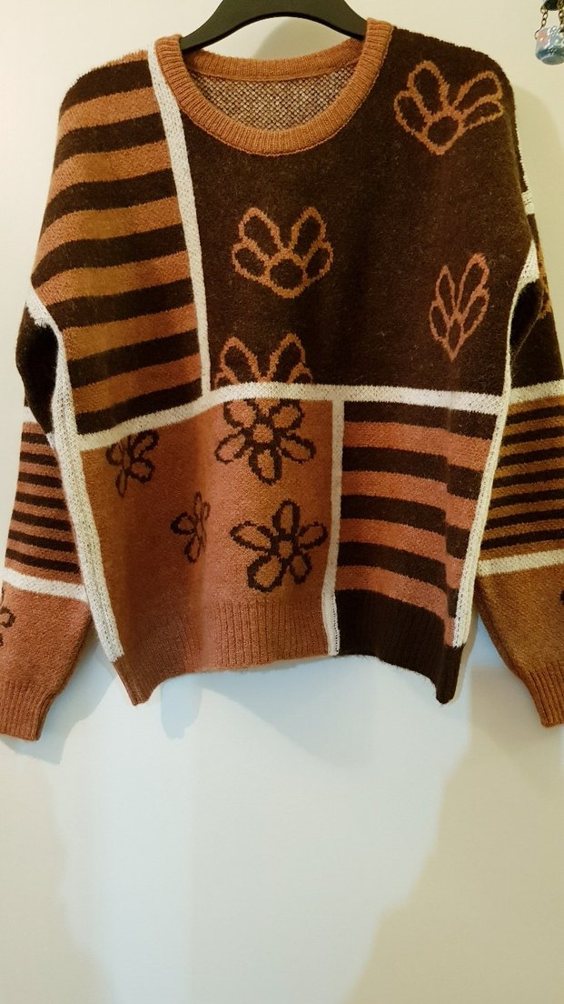 Bohem desenli, kahverengi triko kadın kazak, uzun kollu ve yuvarlak yaka. Rahat kesimi ve midi boyu ile günlük kullanım için uygun.