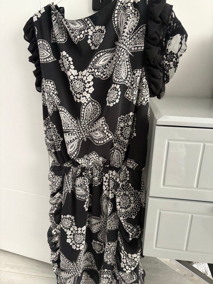 Siyah desenli, bol kesim, kısa kollu, V yaka ve fırfır detaylı kısa bohem elbise.