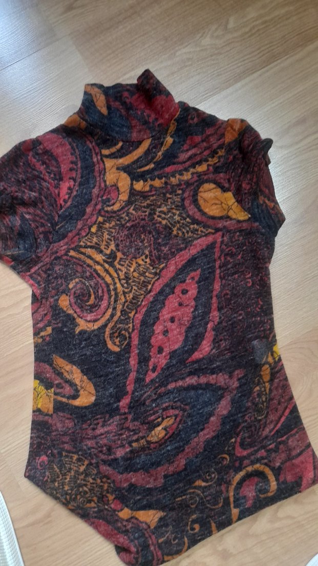 Boğazlı, kısa kollu ve vücuda oturan bu bluz, örgü dokusu ve çok renkli bohem desenlere sahiptir. Kısa boyu ile günlük kullanıma uygundur.