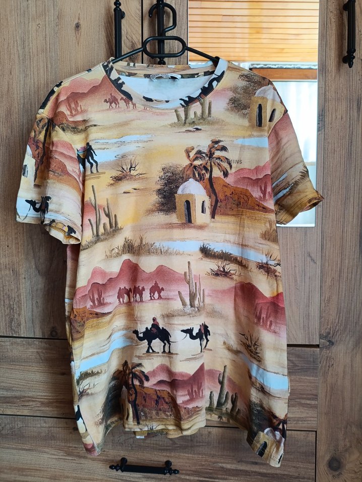 Kısa kollu, bohem desenli tişört. Gevşek kesim ve yuvarlak yaka, pastel camel tonlarında yumuşak dokulu kumaştan.