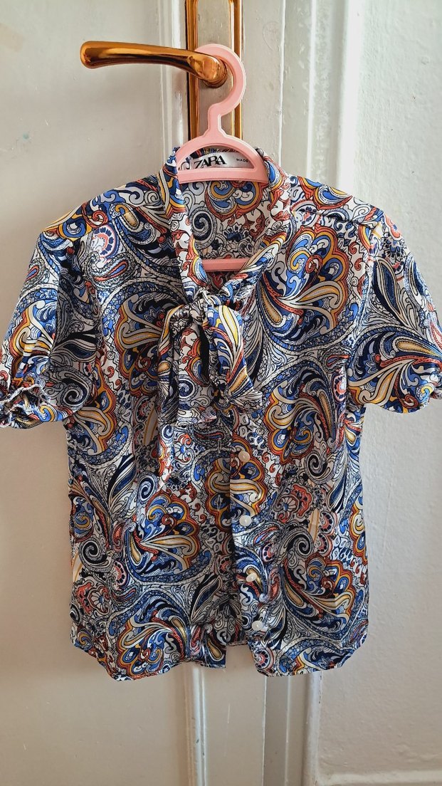 Bohem tarzda, kısa kollu, yakalı ve düğmeli kadın gömleği. Yumuşak dokulu, bol kesim ve çok renkli paisley desenlidir. Günlük kullanıma uygundur. Kızıma büyük olduğu için giymedi.