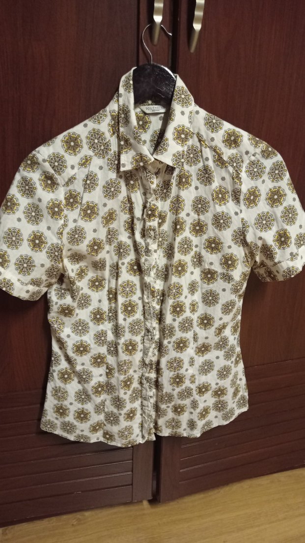 Bohem tarzda, kısa kollu, yakalı ve düğmeli kadın gömleği. Yumuşak kumaştan, kahverengi ve beyaz tonlarda vintage desenli, rahat kesim.