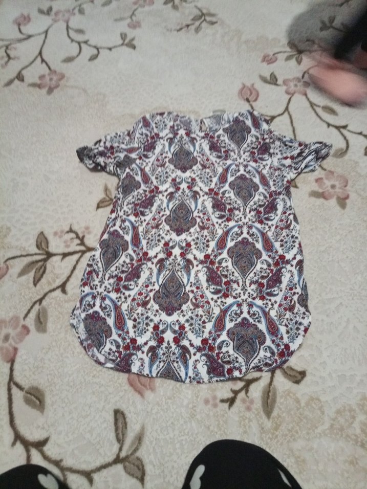 Bohem tarzı, düğmeli kısa kollu tşhrt Gri tonlarda çok renkli batik desenli, rahat kesim, kısa boyda, yumuşak sentetik kumaştan.